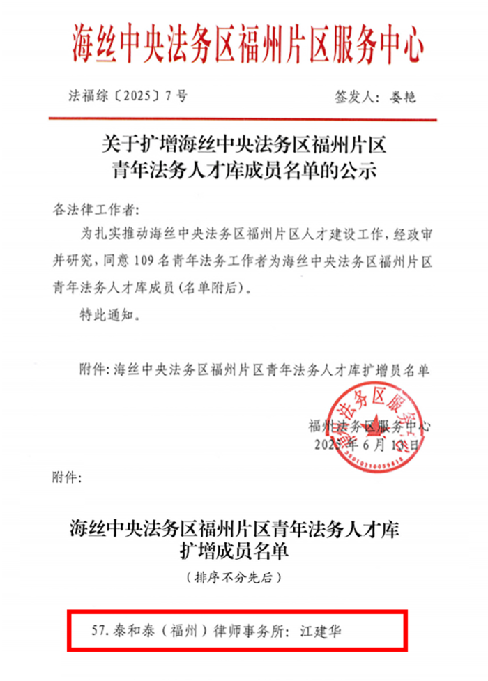 泰和泰福州律师事务所律师入选福建省涉外法律咨询顾问团、海丝中央法务区福州片区青年法务人才库