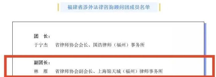 福建省涉外法律咨询顾问团 近日,省司法厅和省律师协会共同成立“福建省涉外法律咨询顾问团”,集合了全省100余名优秀涉外律