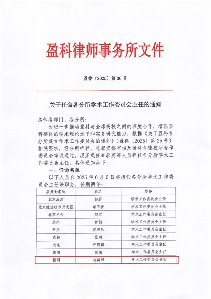 施鲜锋律师担任盈科福州律师事务所学术工作委员会主任