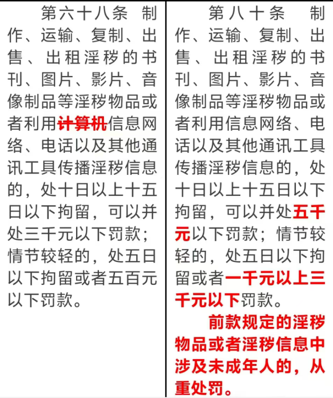 通过对比新旧法条可以看出,对违法行为的界定基本保持一致。制作、运输、复制、出售、出租淫秽物品,以及利用各类通讯手段传播淫秽信息,均为原有法条已明确禁止的行为。新法条延续这一定义。新法的主要修改体现在以下方面:将“计算机信息网络”调整为“信息网络”,覆盖更多传播形态;同时调整了罚款的上下限,提高了违法成本;此外,新增了对涉及未成年人情形的从重处罚规定,进一步加强了对未成年人的保护。