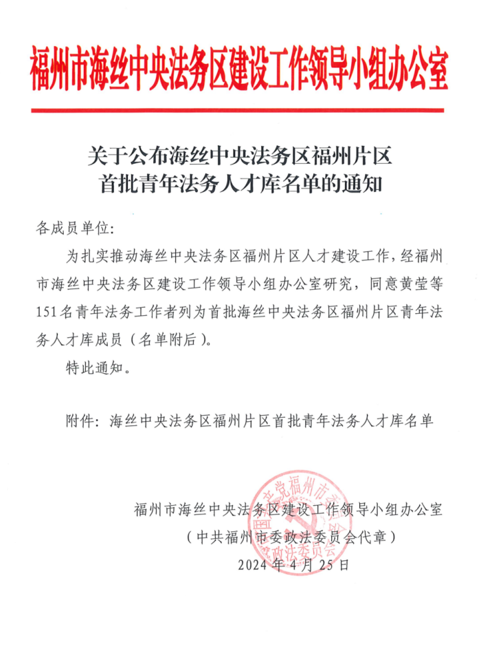 福州律师资讯:海丝中央法务区福州片区首批青年法务人才库名单正式发布! 福州律师资讯发布者 福州律师网2024年4月28日为扎实推动海丝中央法务区福州片区人才建设工作,经福州市海丝中央法务区建设工作领导小组办公室研究,同意黄莹等151名青年法详情