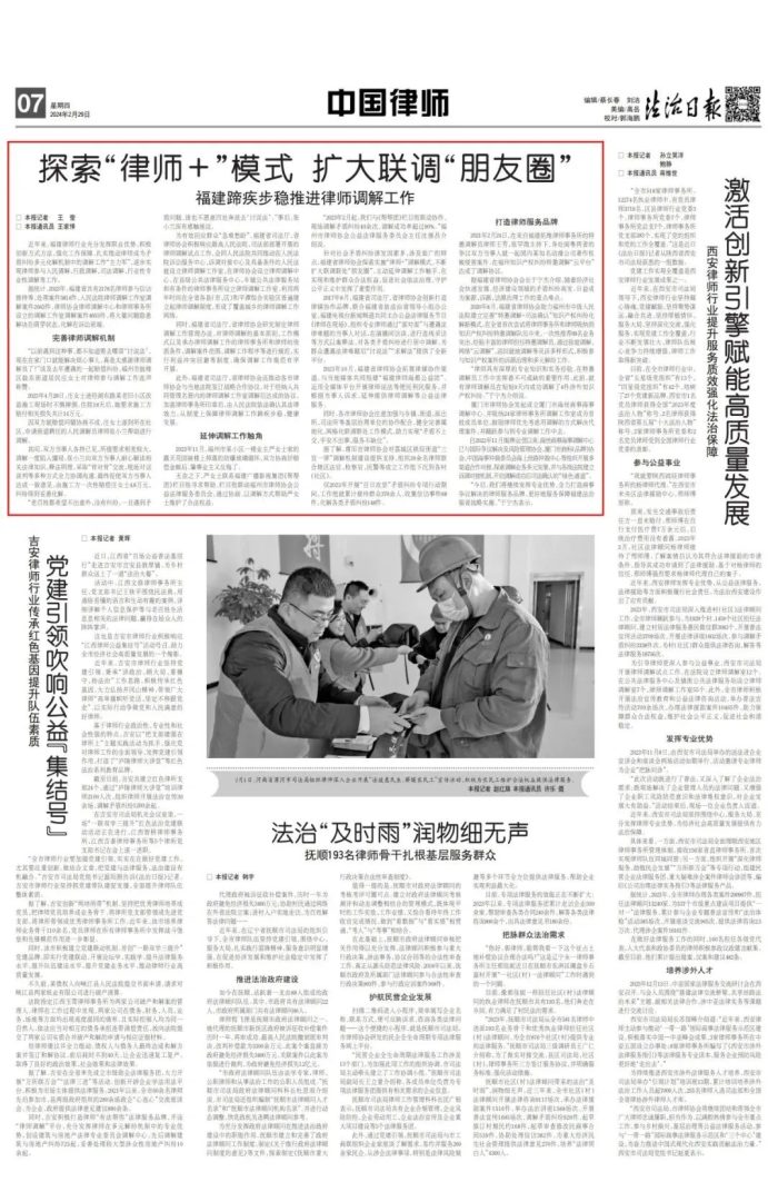 新春“开门红”!《法治日报》突出报道福建省律师调解工作 福州律师资讯发布者 福州律师网2024年3月4日2月29日,中央政法委机关报《法治日报》“中国律师”版头条刊发通讯稿件《探索“律师+”模式 扩大联调“朋友圈”——福建蹄详情