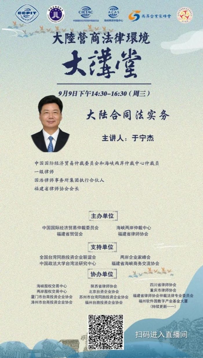 “大陆营商法律环境大讲堂”预告丨省律协会长于宁杰:大陆合同法实务 福州律师资讯发布者 福州律师网2020年9月7日为便利台商台企在大陆投资兴业,中国国际经济贸易仲裁委员会、海峡两岸仲裁中心、福建贸促会、福建省律师协会等单位联合举办“大详情