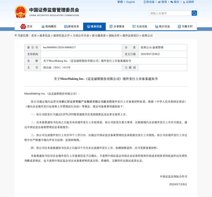 大成福州律师事务所助力好定多集团完成境外上市证监会备案 福州律师资讯发布者 福州律师网2024年7月19日2024年7月8日,中国证监会国际合作司发布关于MaxsMaking Inc.(迈克丽斯股份有限公司)境外发行上市备案通详情