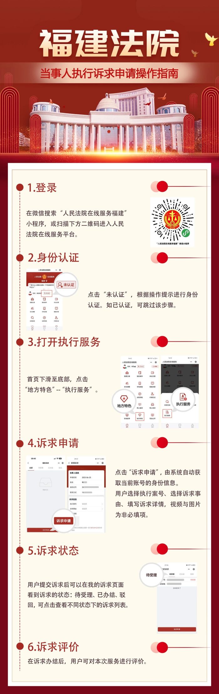 福州律协发布:快收藏!福州法院执行服务指南来了! 福州律师资讯发布者 福州律师网2023年8月11日为满足群众多层次、多样化的执行服务需求,提升便民利民、高效优质的执行服务能力,今年以来,福州两级法院以一站式服务为目标,详情